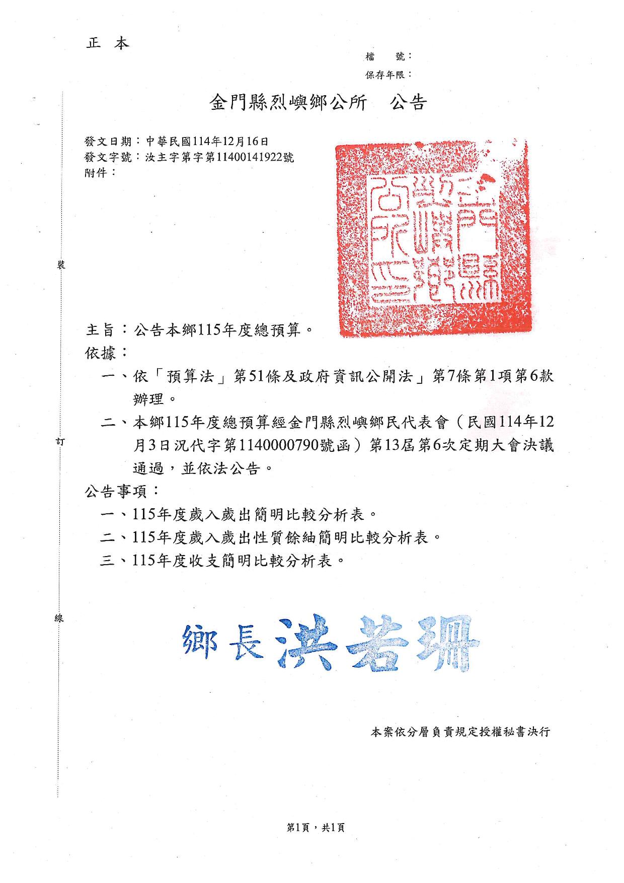115年度本鄉總預算