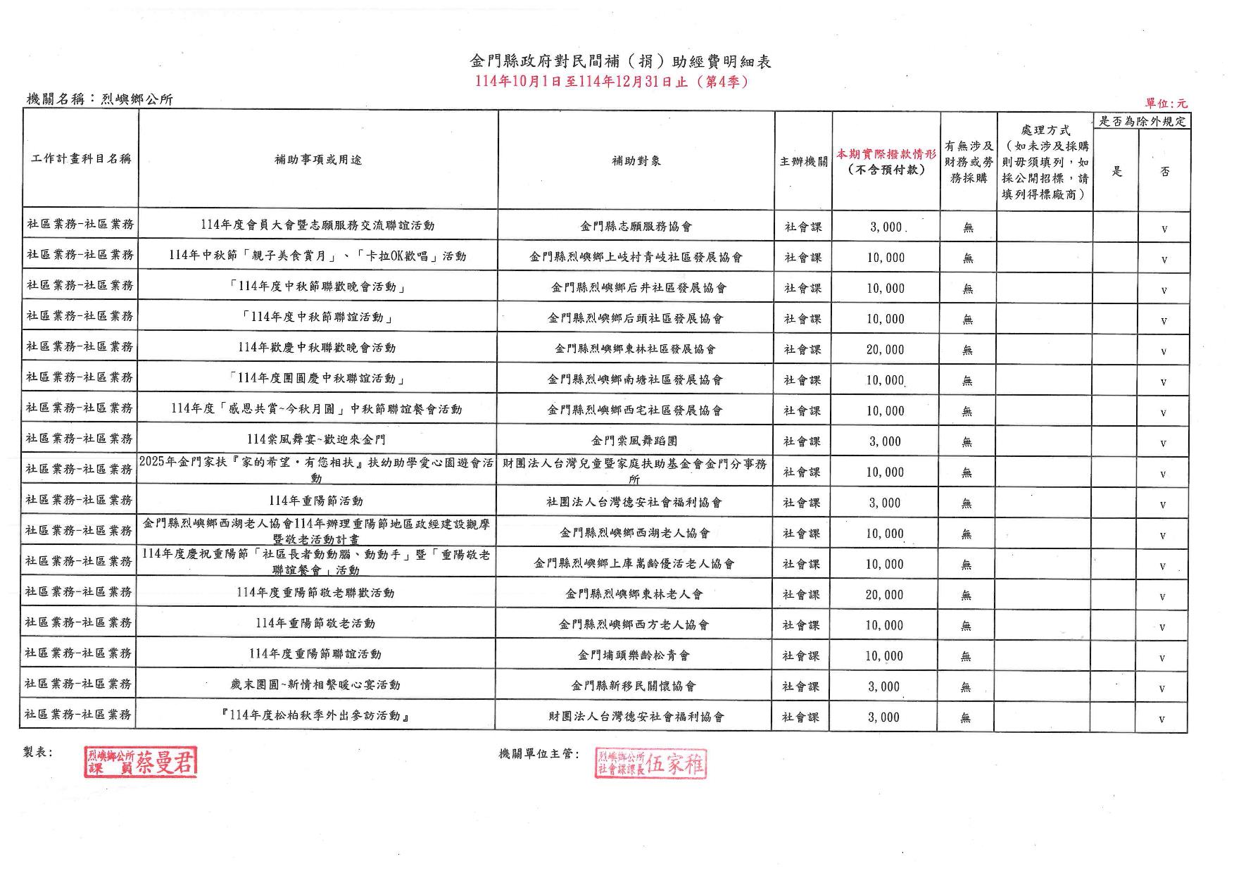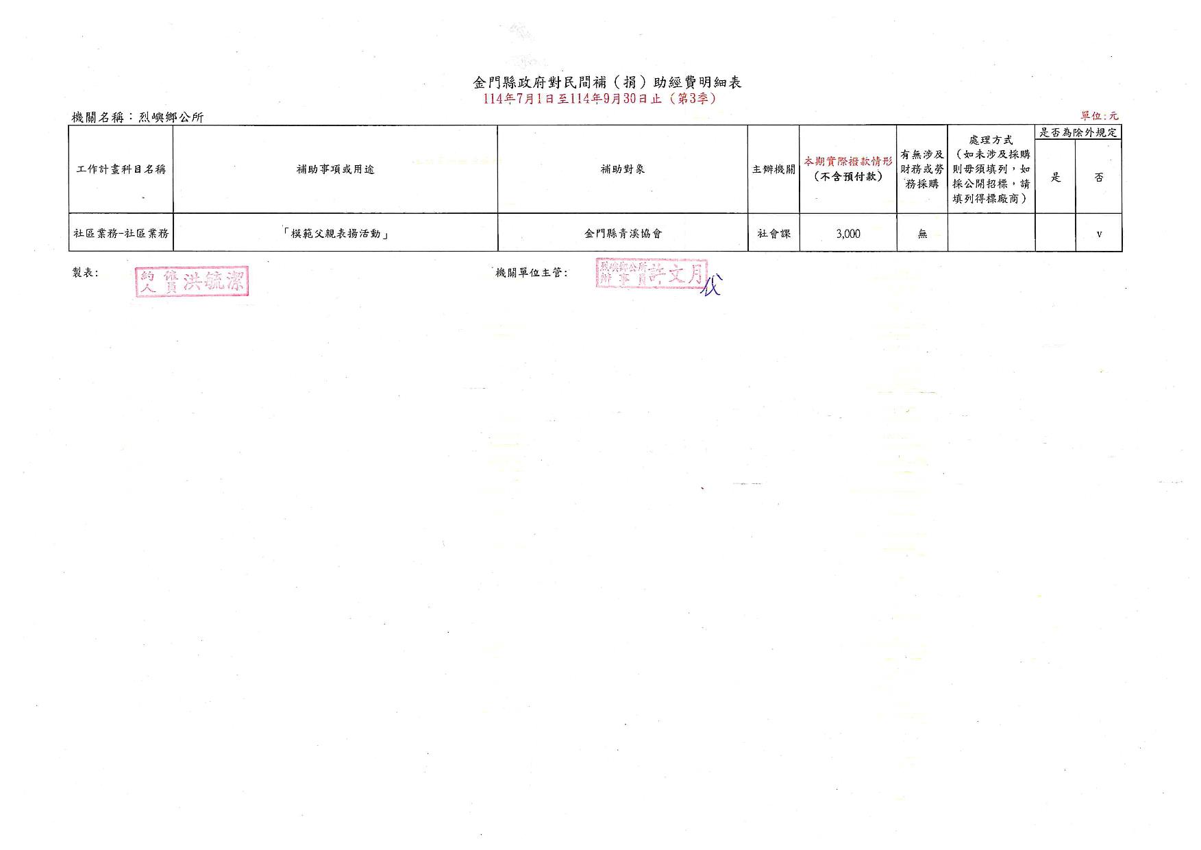 114年度烈嶼鄉公所對民間團體補(捐)助季報表