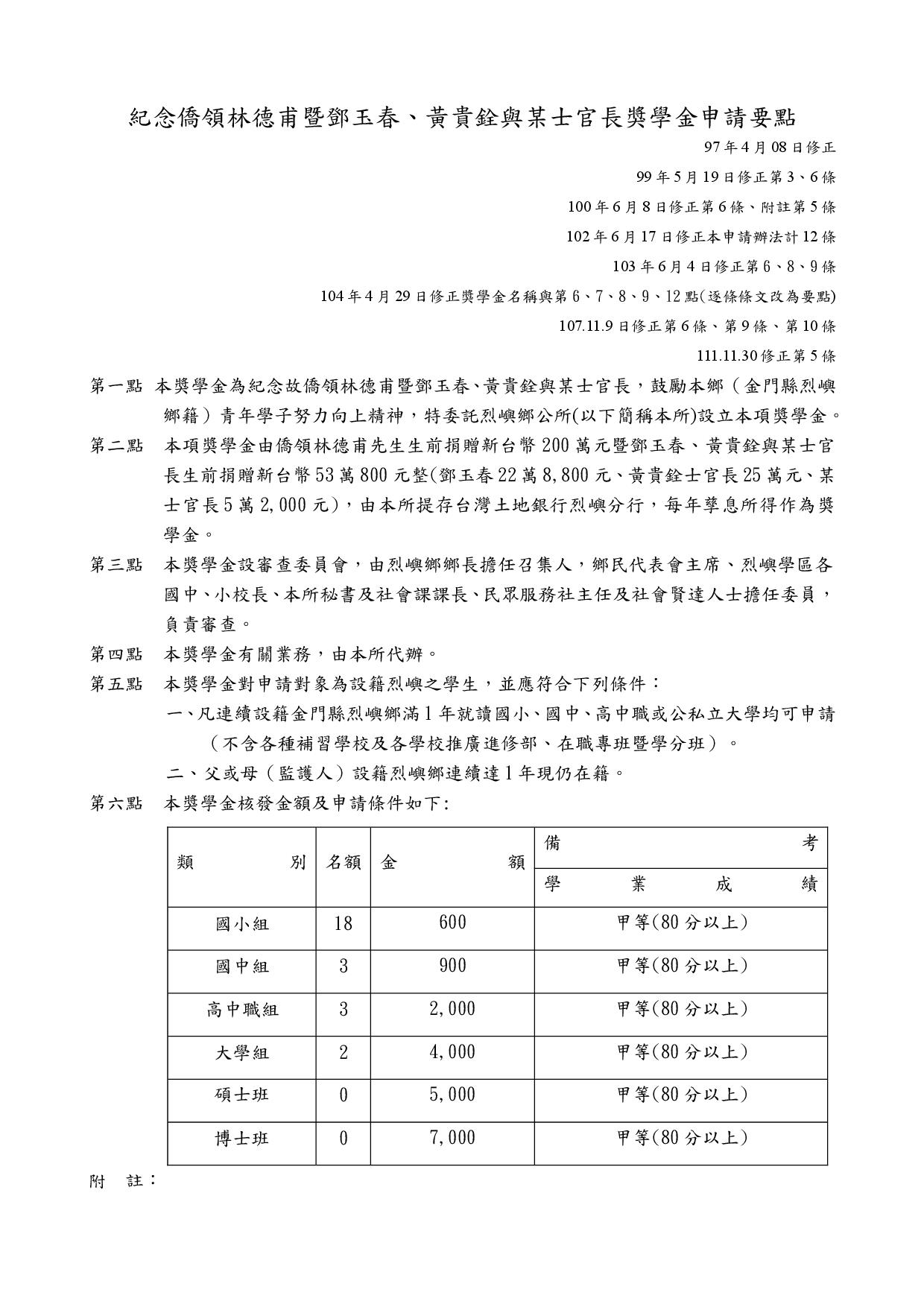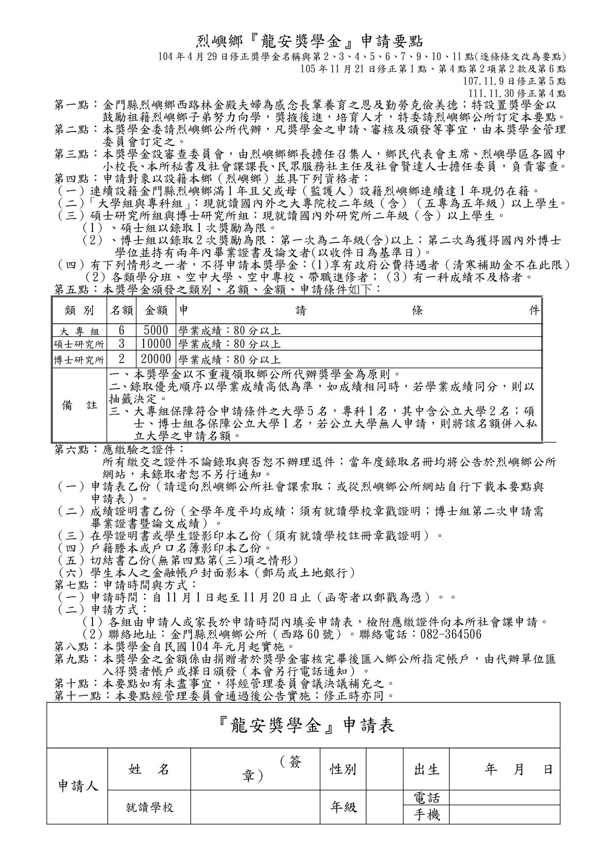 紀念僑領林德甫暨鄧玉春、黃貴銓與某士官長獎學金 以及龍安獎學金 開始受理申請囉 申請時間:自11/1日起至11/20日止(函寄者以郵戳為憑) 申請方式: 1、紀念僑領林德甫暨鄧玉春、黃貴銓與某士官長獎學金: 國中、國小組由本鄉各學校直接申請,不受理個別申請。高中、高職及大專、研究所等可自行送達或掛號至本所社會課。 2、龍安獎學金: 由申請人或家長於申請時間內填妥申請表,檢附應繳證件向本所社會課申請。 郵寄地址:金門縣烈嶼鄉西路60號(烈嶼鄉公所)